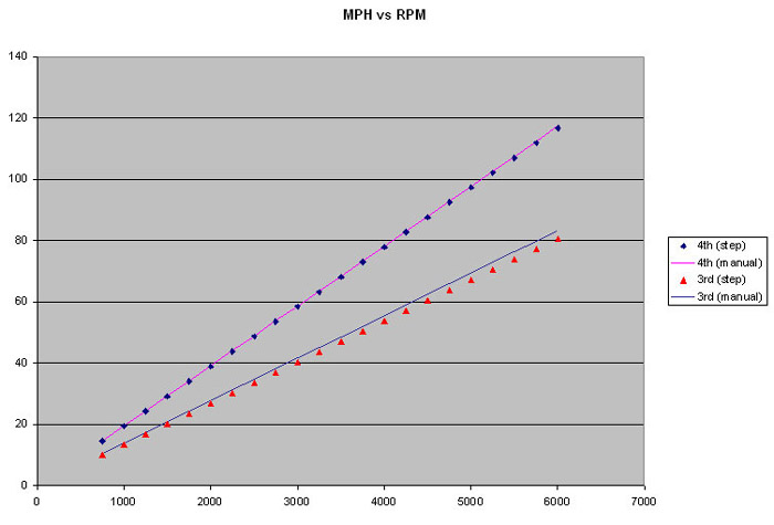 So there you have it. That Z3 should have taken an extra +3 points as well. MPH vs RPM for Steptronic and Manual BMW? But is taking that +3 points for (29) even justified? So Steptronic has different gear ratios compared to its manual transmission counterpart. The question is how does having different gear ratios be an advantage to me? This is one question that Greg unfortunately has yet to confirm. For an illustation, I plotted the 3rd and 4th gear of my steptronic and its manual equivalency: